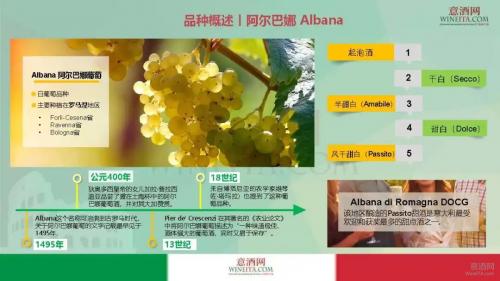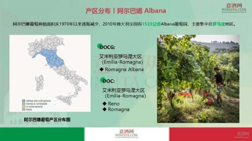 阿尔巴娜(Albana)是艾米利亚罗马涅(Emilia-Romagna)大区中罗马涅地区的代表性白葡萄品种,常见于Forlì-Cesena、Ravenna 和 Bologna等省份。