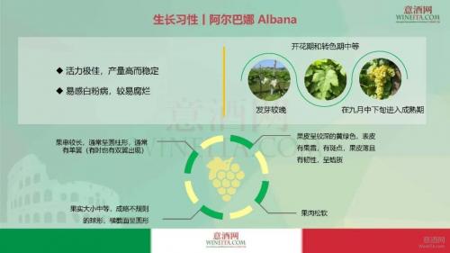 阿尔巴娜葡萄藤活力极佳,产量高而稳定,易感白粉病,较易腐烂。阿尔巴娜葡萄发芽较晚,开花期和转色期中等,在九月中下旬进入成熟期。成熟后的阿尔巴娜葡萄果串较长,通常呈圆柱形,通常有单翼(有时也有双翼出现)。果实大小中等,成略不规则的球形,横截面呈圆形;果皮呈较深的黄绿色,表皮有果霜,有斑点,果皮有韧性,呈蜡质。果肉松软。