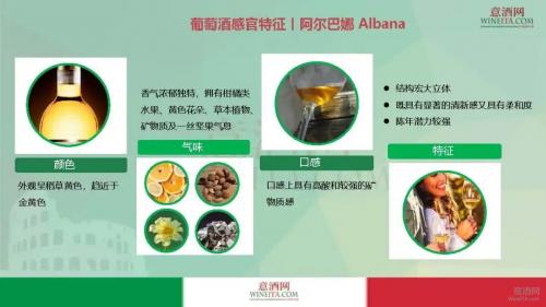 使用阿尔巴娜酿造的干型葡萄酒外观呈稻草黄色,趋近于金黄色,个性鲜明,香气浓郁独特,拥有柑橘类、核果类果香、黄色花朵、草本植物、矿物质及一丝坚果气息,口感上具有高酸和较强的矿物质感,结构宏大立体,既具有显著的清新感又具有柔和度,和谐平衡,余味可能带有轻微的苦杏仁味,具有较强的陈年潜力。此外,由于阿尔巴那葡萄同时兼具较高的糖分和酸度,也具备酿造优质甜型葡萄酒的潜力,当地的阿尔巴那风干甜酒(Passito)一直备受欢迎。还有酒庄将阿尔巴那葡萄用来酿造起泡酒,也有不错的表现。
