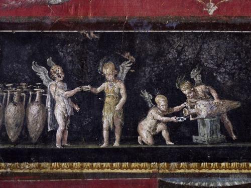 维提之家(House of the Vettii)有一间献给罗马神话酒神巴库斯的房间,这件房间中的壁画生动展现了正在采摘葡萄的丘比特神,以及葡萄酒酿造过程中的仪式、细节。除了这幅壁画,这座豪宅内部其他的雕塑、家具装饰细节等,都反映出当时庞贝古城葡萄酒贸易的繁盛,当地酿造的葡萄酒已经出口到整个地中海地区。除了葡萄酒,庞贝还是当时地中海的农业产品、农业贸易中心之一。