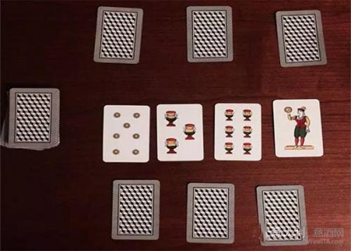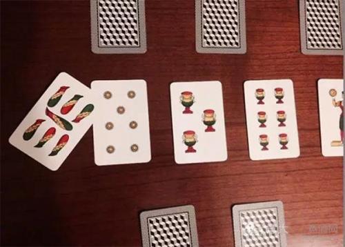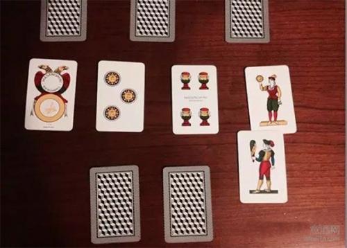 如果玩家打出的牌能够一下扫光桌面上所有的牌,就说明玩家玩了一次“SCOPA”。最后计分的时候,一次”SCOPA”算1分。每打出一次“SCOPA”,计分牌里就该有一张牌正面朝上,以方便最后计分。(如下图所示)