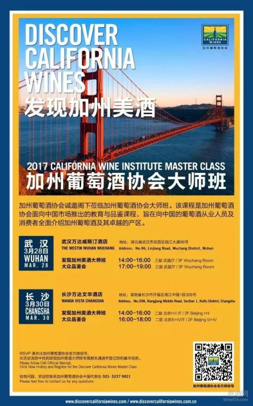 2017年度新的一系列“发现加州美酒”大师班及品鉴会已经拉开帷幕,我们等不及要带着加州美酒,在美丽的烟花三月,来跟武汉和长沙的小伙伴们见面啦!新的城市,新的大师班课程用酒,2017年许许多多值得期待!