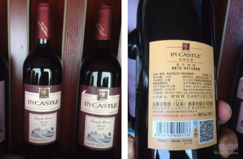 而另一款名为INCASTLE的葡萄酒,其正标则没有一个中文出现,邮票、素描、城堡的设计,乍看之下与法国酒庄酒无差别,背标则有位于烟台的分装商信息。