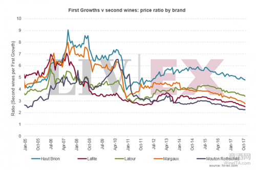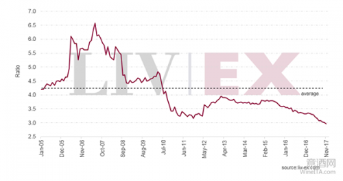今年8月,一级酒庄的主牌与副牌葡萄酒的价格比率 (优质葡萄酒50指数中的葡萄酒总价格除以副牌葡萄酒50指数中的葡萄酒总价格)更低于2011年12月时创下的最低3.15纪录。
