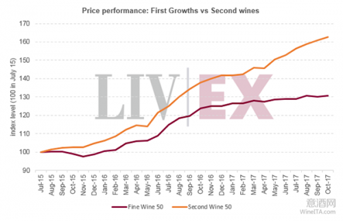 自2015年6月,葡萄酒市场又再次走强,而副牌葡萄酒相对于主牌葡萄酒已变得更加昂贵。由于去年英国脱欧的冲击,加快了副牌葡萄酒继续涨价,使这比率更进一步下跌。 2017年,副牌葡萄酒50指数上升17.6%,表现仅次于勃艮第150指数。相比之下,优质葡萄酒却只微升5.5%。