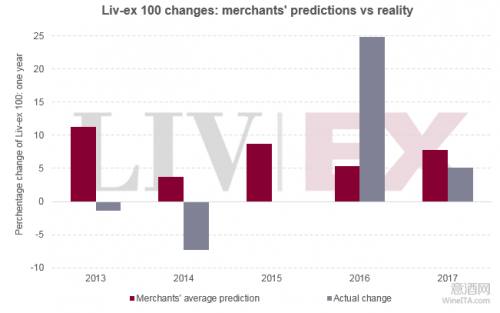 2017年度Liv-ex 100指数已出炉,大部分酒商对去年该指数的收盘水平都只是略有高估,总体而言,酒商对2017年度的指数走势预测比前几年更接近。