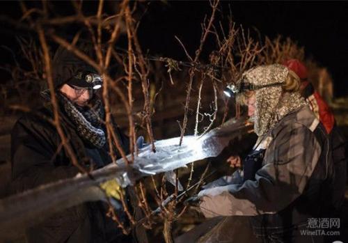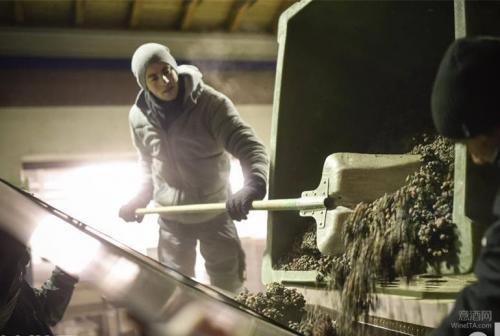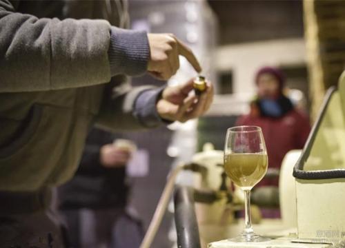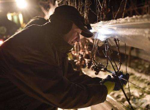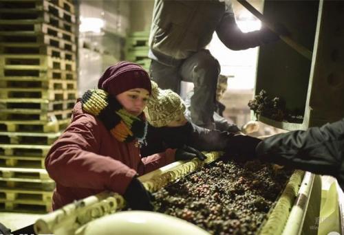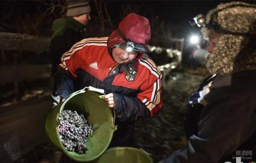 1月19日,德国瑙姆堡酿酒师将收集的葡萄倒入一个容器里,冰葡萄酒的酿制需要零下11度的葡萄。自2012年以来,这座位于萨克森 - 安哈尔特州的乡村庄园首次酿制冰葡萄酒。葡萄采集需要从凌晨3点开始,整个加工过程中葡萄都必须保持冰冻状态。