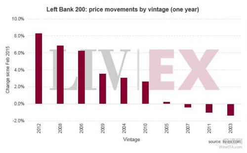 左岸200指数是由10个不同年份的20款左岸葡萄酒组成。下图显示了在过去一年来不同年份的整体表现。