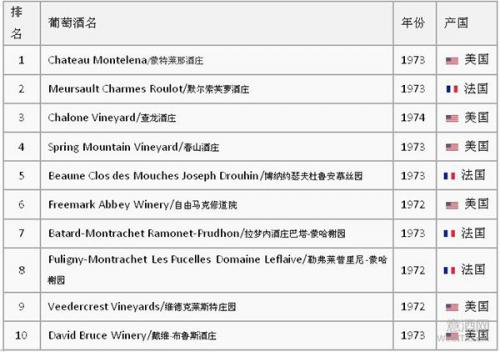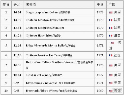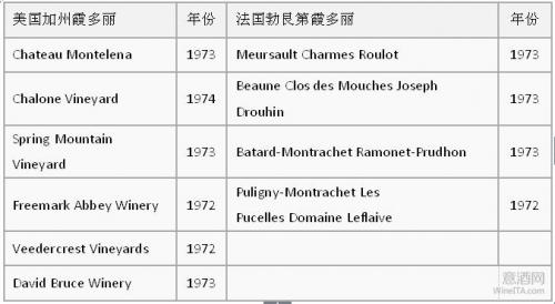 1976年5月24日,英国酒商史蒂芬·斯珀里尔(Steven Spurrier)在巴黎组织了一场别开生面的葡萄酒盲品大赛。比赛分两部分,需要盲品选出最佳红,白葡萄酒。参赛的红葡萄酒来自法国的波尔多和美国的加州;白葡萄酒来自法国的勃艮第和美国的加州。比赛的结果是:美国加州的葡萄酒拔得头筹占据红白榜首,这不仅让法国人惊讶,也让全世界对美国葡萄酒刮目相看。