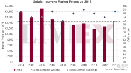 索拉亚 Solaia 2013年现已发布,每瓶的前酒商价为130欧元,等同于其2012年份。但由于英镑的疲弱,在英国市场的发行价却比去年高,每箱12×75为1,450英镑。