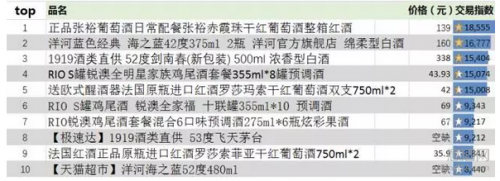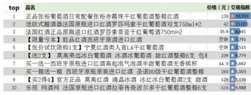 2016年11月11日天猫、淘宝葡萄酒单品支付子订单数Top 10
