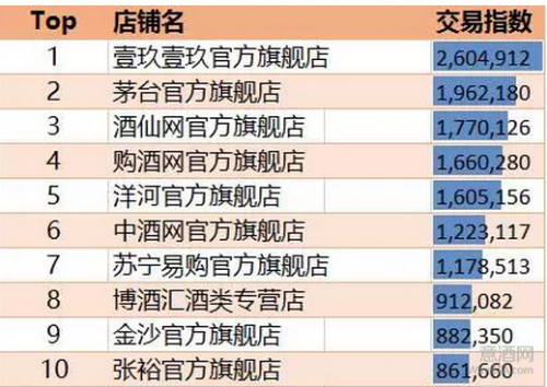 2016年11月11日天猫、淘宝酒行业店铺交易指数Top 20