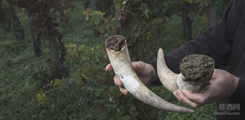 生物动力农业需要一些特殊的堆肥措施,其中最有名的就是“牛角粪肥”了。葡萄园会搜集大量的母牛角,往里面塞满粪便堆肥,然后在冬季之时埋在葡萄园的各个角落里。经过大概4-6个月的时间后,再把牛角挖出来。在和土壤亲密接触的这段时间里,牛角里的肥料物质就会被土壤均匀且充分地吸收。
