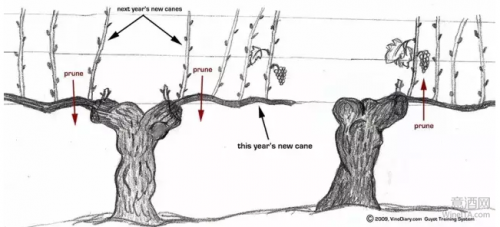 葡萄藤在生产过程中,生长的形状需要得到控制,由此便诞生了这一种“居由式”(Guyot)的整形方式。