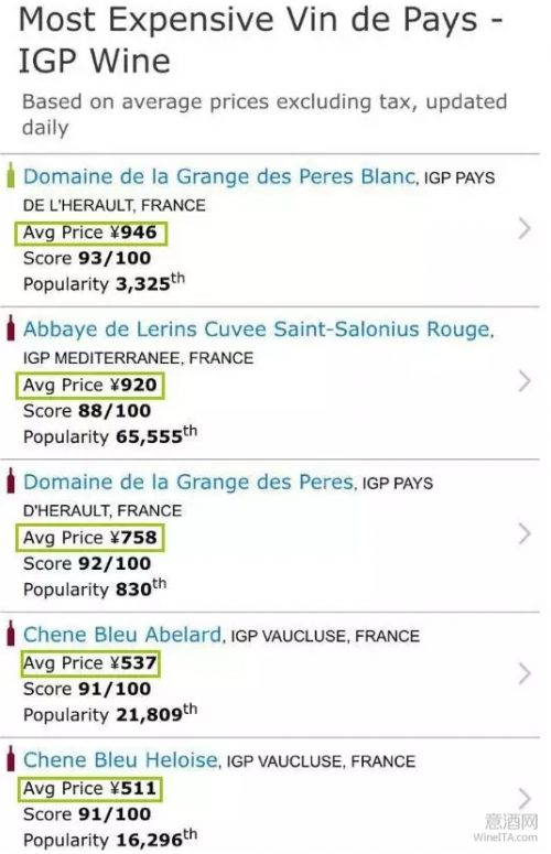 以上是国际知名葡萄酒比价网站 WS 截图,其中的价格为国际税前均价,最贵的 IGP 葡萄酒在国外都可以卖到上千块,这岂不是将一大波 AOC 葡萄酒远远甩在身后了吗?此为其一!