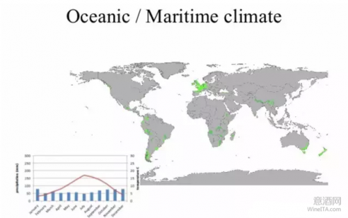 世界葡萄酒产区主要分布在南北纬30°~50°之间,所以大部分产区都属于温带海洋性气候。地中海气候属于海洋性气候的一种,前面的文章已经介绍过,在此就不赘述了。
