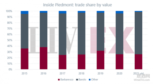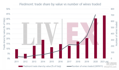 在Liv-Ex的意大利精品酒交易纪录中,皮埃蒙特酒交易额所占比例在2015年为11.4%,2020年上升为43.4%,五年增长了32%。2020年的交易笔数比2019年增长了181%。2020年的交易记录中,意大利皮埃蒙特大区的葡萄酒单品数量达到708种,五年内增长了653%,达到历史新高。