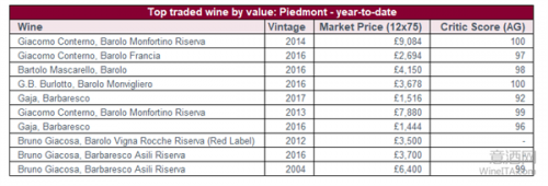 迄今为止,皮埃蒙特精品葡萄酒交易的前十名葡萄酒中,有六款是巴罗洛(Barolo)干红,其余的都是巴巴莱斯科(Barbaresco)干红。皮埃蒙特产区著名的酒款,如贾科莫·孔泰诺(Giacomo Conterno)、嘉雅(Gaja)和布鲁诺·贾科萨(Bruno Giacosa)占据了榜单的主导地位。同时,一些以往二级市场不太常见的品牌走势也越来越坚挺,例如Vietti、Luciano Sandrone、Roberto Voerzio、Ceretto和Domenico Clerico,都是受到买家欢迎的酒庄品牌,它们的交易量持续增长。
