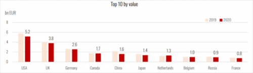 澳大利亚出口额为18亿欧元,同比下降2.3%。智利出口额为16亿欧元,同比下降7.1%。美国出口额和新西兰出口额都为11亿欧元,但美国同比2019年下降8.5%,新西兰同比2019年增长4.5%。德国出口额为9亿欧元,同比下降16%。葡萄牙出口额为8.46亿欧元,同比增长3.3%。阿根廷出口额为7亿欧元,同比下降4%。