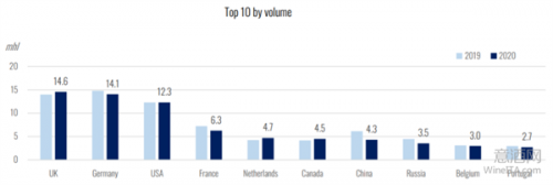 上图:2020年葡萄酒进口量前十大国家