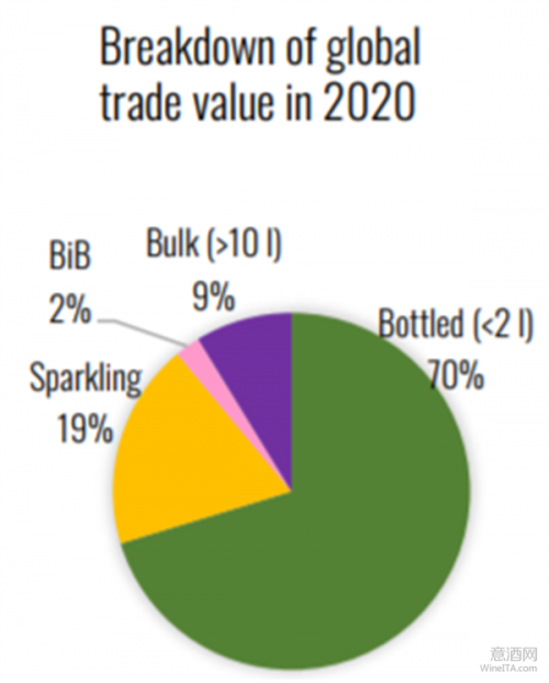 2020年全球瓶装葡萄酒(容量小于2L)的贸易量占葡萄酒总贸易量的50%,贸易额占总贸易额的70%,与过去两年基本一致。