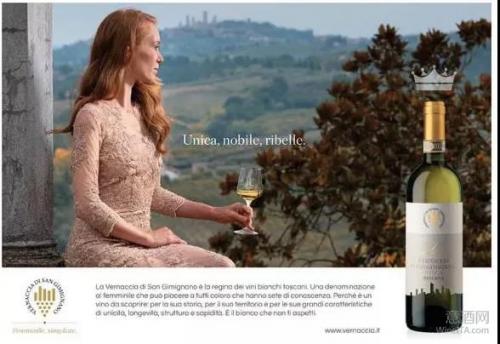 ”Unica, nobile, rebelle.“ 是产区协会最新发布的产区品牌形象主题宣传语。圣吉米尼亚诺的维奈恰(Vernaccia di San Gimignano)葡萄酒给人的印象,正如一位独特、高贵且具有反叛精神的优雅女性,令人难忘。以明确的女性化形象作为产区品牌风格,令人印象深刻耳目一新。
