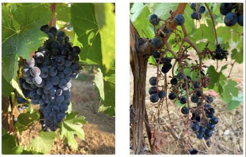左:静待采摘的葡萄串;右:遭野猪拱食的果串(鸣谢托斯卡纳多菲Dolfi酒庄提供现场图片)