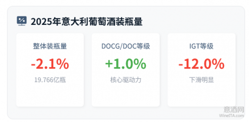 报告透露,意大利保证法定产区DOCG 和法定产区 DOC 两个等级的葡萄酒2025年装瓶量同比增长 1%,无论是同比2024年相比还是与近三年的平均值相比均为正增长。与之相反,原产地保护产区IGT 等级葡萄酒2025年的装瓶量出现明显下滑,较 2024 年大幅减少12%,较前三年的平均值下降 10%。