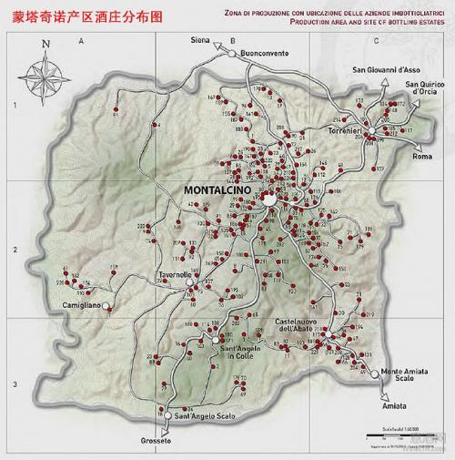 同时,蒙塔奇诺产区内遍布的丘陵走向各不相同,形成了非常多样的微气候。通常而言,朝北的山坡接受阳光的时间要短一些,比朝南的山坡更为凉爽,酿造出的酒更为芬芳。朝南和朝西的山坡光照时间更长,同时有更多的海风吹拂,酿造的酒更有力、复杂。顶级的酒庄往往在两种朝向的山坡上都有葡萄园,然后用不同风格的葡萄进行混酿。