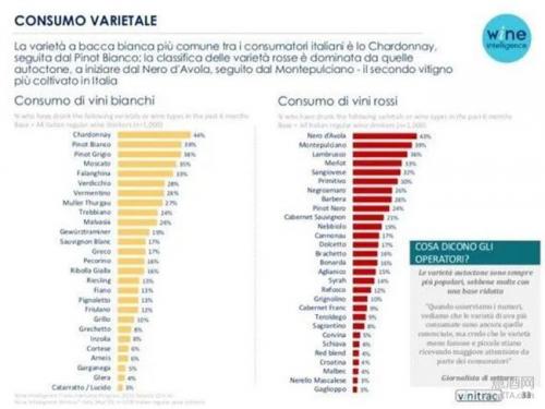 这份报告还显示,意大利人消费最多的白葡萄品种依次是白皮诺 (Pinot Bianco)、灰皮诺(Pinot Grigio)、霞多丽(Chardonnay)、莫斯卡托(Moscato)、法兰吉娜 (Falanghina)和维迪奇 (Verdicchio)。
