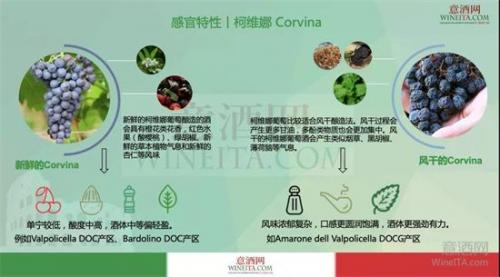 因此,用风干的柯维娜为主要品种酿造的葡萄酒,例如阿玛罗奈(Amarone della Valpolicella)红葡萄酒,拥有更为浓郁复杂的气息风味,口感更圆润饱满,酒体更强劲有力。
